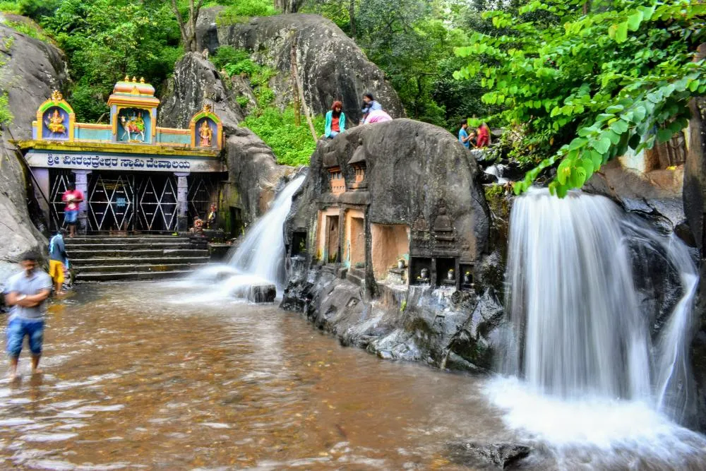 Kalhatti Falls distinguishes itself through its unique association with the ancient Veerabhadra Temple, situated directly at the falls’ base. The 122-metre cascade flows over the temple structure, creating an extraordinary confluence of natural wonder and spiritual heritage. Pilgrims and tourists ascend numerous steps carved into the hillside, passing through the temple before reaching viewpoints offering spectacular vistas of the surrounding Chikmagalur landscape.